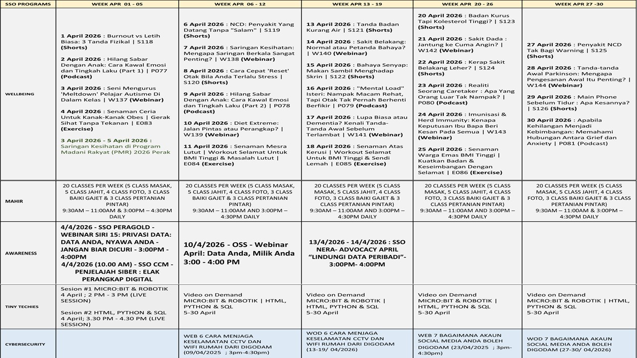 Tarikh 23 April 2026 Masa 3.00 petang – 4.30 petang Tempat NADI Taman Harmoni Peserta 1 Orang Tujuan: Tujuan webinar ini adalah untuk memberi kefahaman kepada peserta tentang kaedah akaun media sosial boleh digodam seperti melalui pautan palsu, phishing dan […]