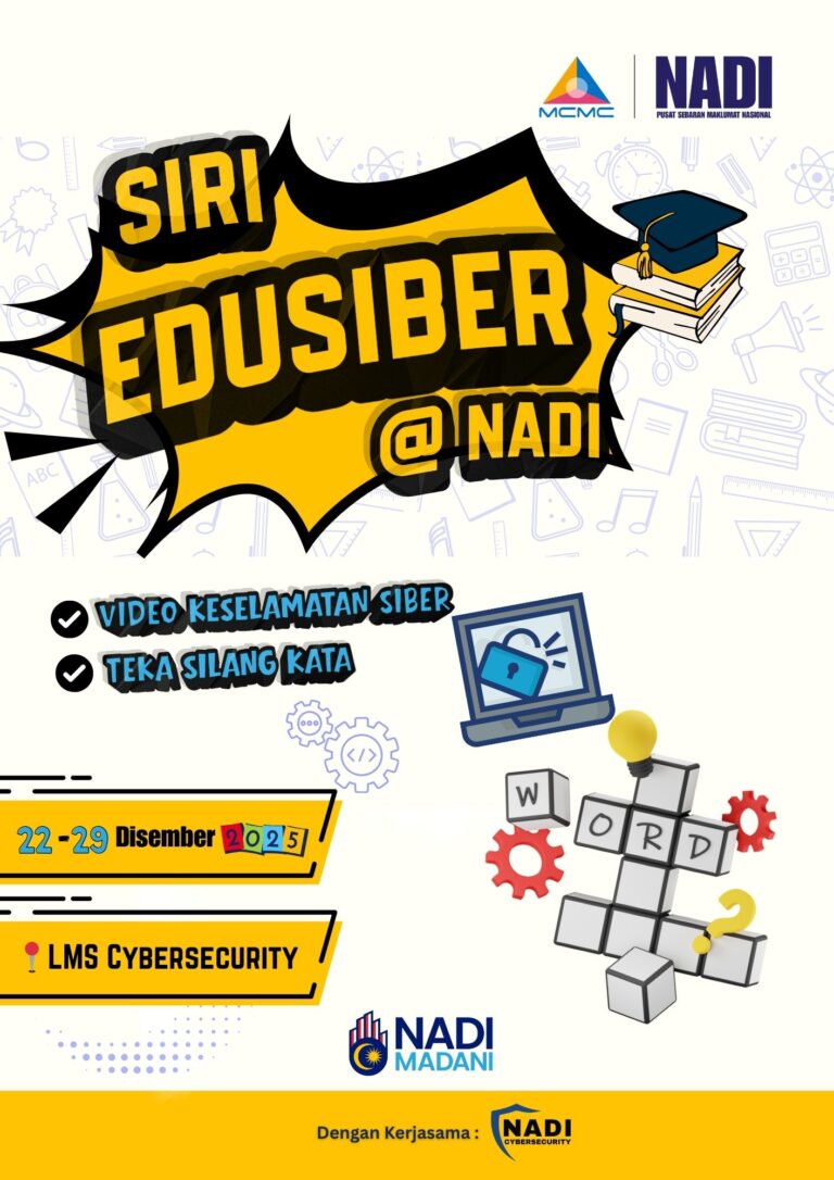 arikh 22 – 26 Disember 2025 Masa 9.00 pagi – 5.00 petnag Tempat NADI Taman Harmoni Peserta 5 Orang Tujuan: Meningkatkan kesedaran keselamatan siber, memberi pendedahan terhadap ancaman siber harian, serta memperkasa tindakan pencegahan dan pelaporan. Aktiviti: 1. Menjalankan aktiviti […]