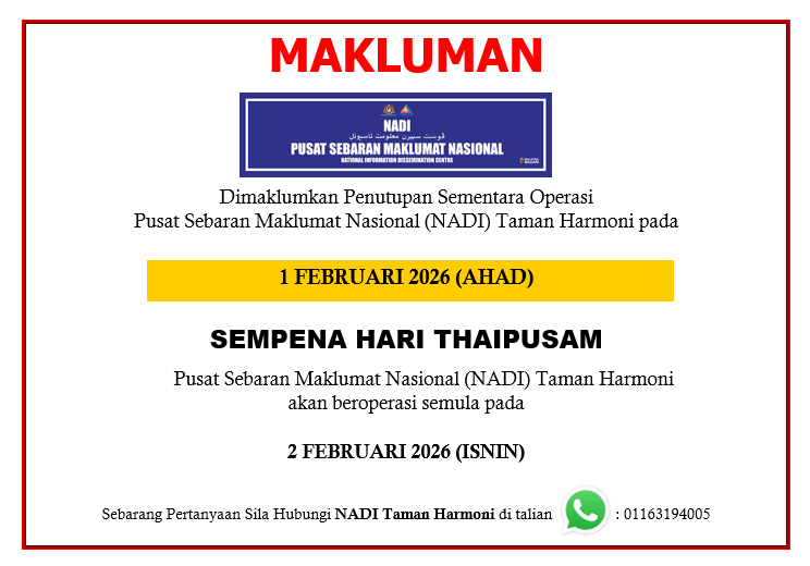 Tarikh 26 Januari 2026 Masa 3.30 petang – 4.30 petang Tempat NADI Taman Harmoni Peserta 5 Orang Tujuan: Program Dilea Open Tuition Sejarah secara dalam talian melalui platform Google Meet pada 26 Januari 2026 dari jam 3.30 petang hingga 4.30 […]