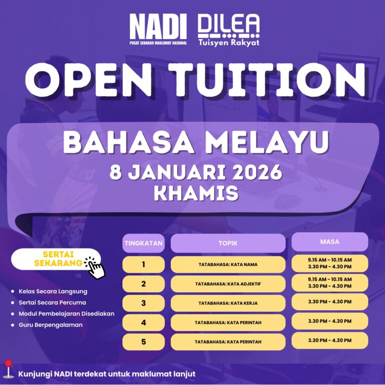Tarikh 8 Januari 2026 Masa 3.30 petang – 4.30 petang Tempat NADI Taman Harmoni Peserta 5 Orang Tujuan: Program Open Tuition Bahasa Melayu diadakan untuk meningkatkan penguasaan murid dalam kemahiran Bahasa Melayu merangkumi kemahiran membaca, menulis, mendengar dan bertutur. Program […]