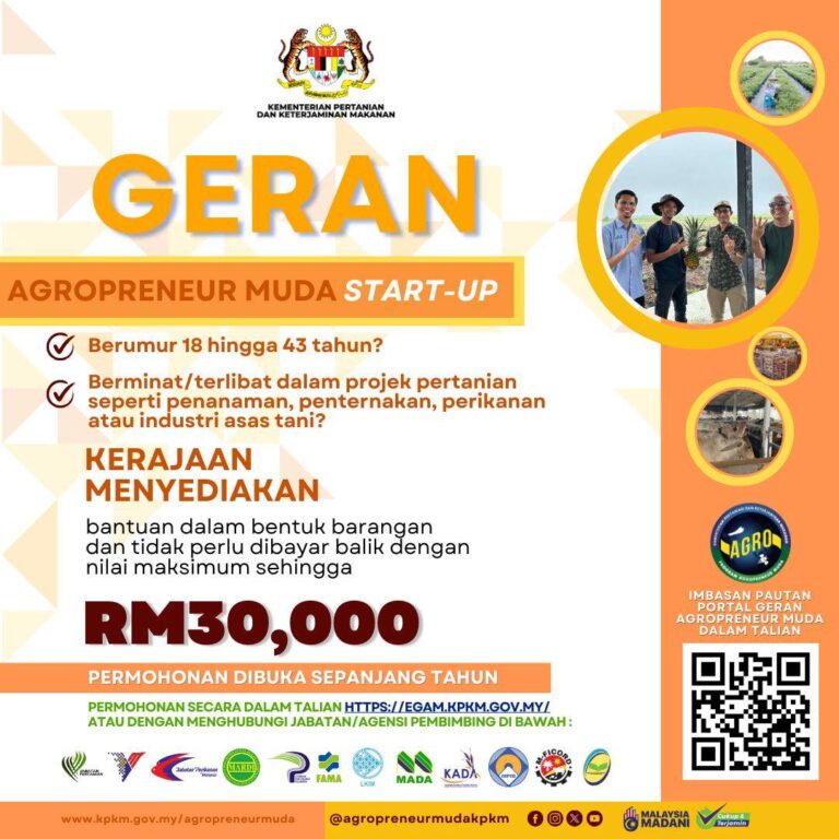 Dah sedia jadi usahawan tani? Jom mohon geran barangan sehingga RM30,000 daripada Kementerian Pertanian dan Keterjaminan Makanan (KPKM)! SYARAT : Permohonan dibuka sepanjang tahun Mohon online: https://egam.kpkm.gov.my Sebarang pertanyaan dan maklumat lanjut, sila hubungi melalui emel di alamat : uam@kpkm.gov.my